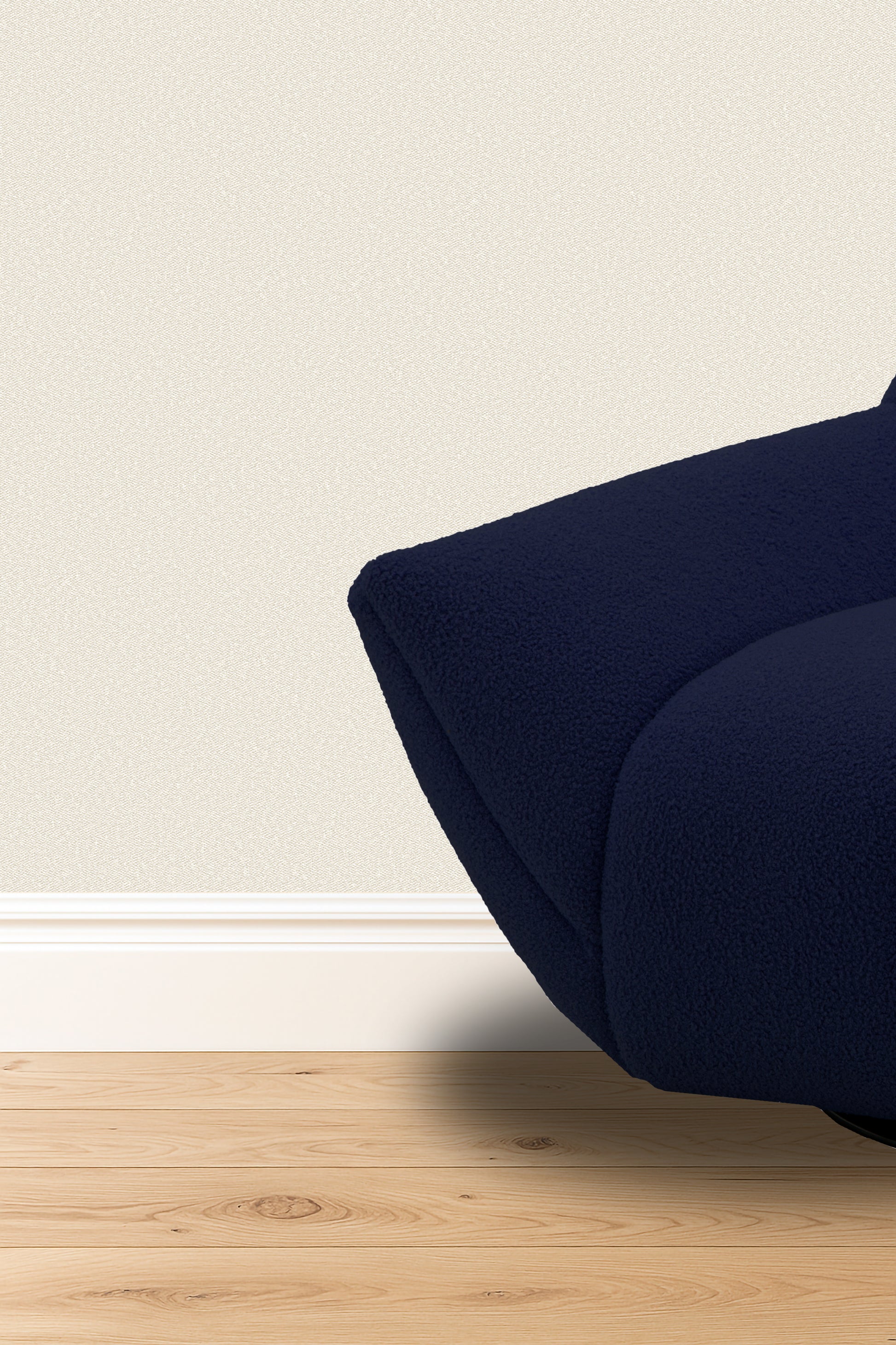 El papel de pared tiene una textura fina y granulada, similar a la de un tejido de lino o una superficie arenisca. El color es un blanco roto o beige muy claro, con una tonalidad cálida y suave.