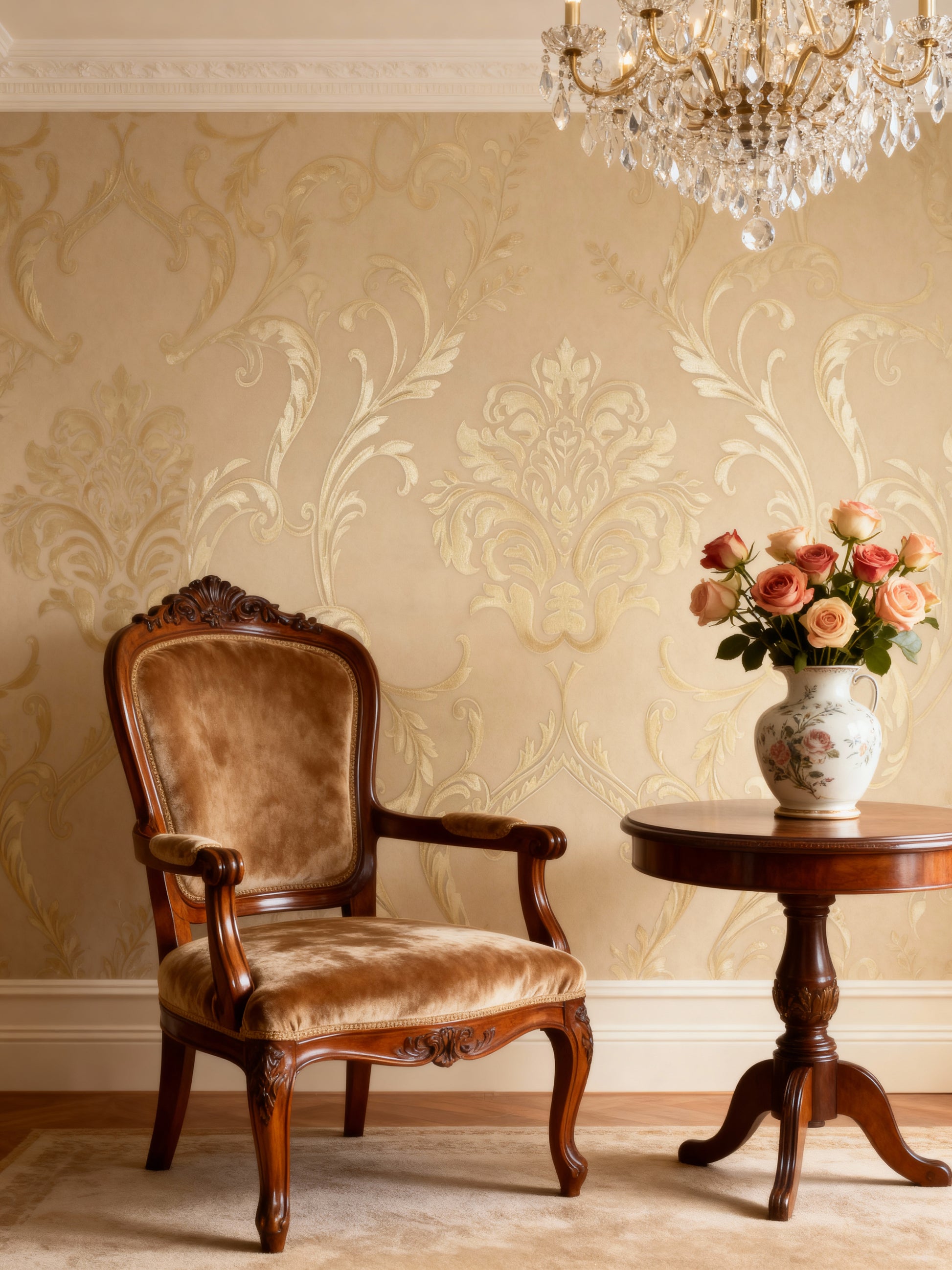 Estilo: Es claramente un diseño de inspiración tradicional y regia, evocando la decoración europea de los siglos XVII y XVIII.