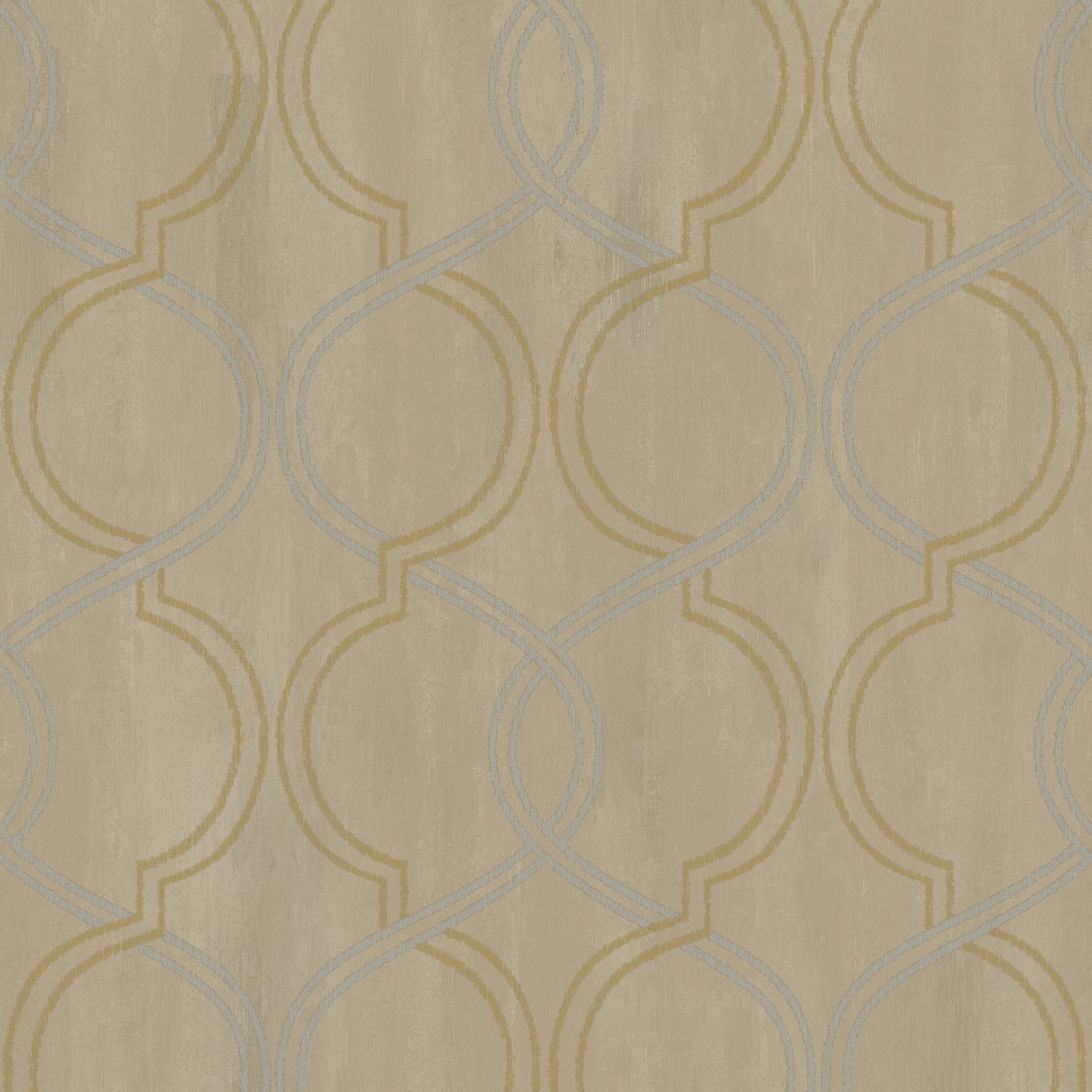 El papel tapiz tiene un diseño geométrico y moderno con un patrón repetitivo de líneas interconectadas que forman una celosía. La paleta de colores es una mezcla de tonos neutros y cálidos: el fondo es de un color crema o beige claro, y el diseño de la celosía está trazado con líneas en color gris pálido y dorado o mostaza.