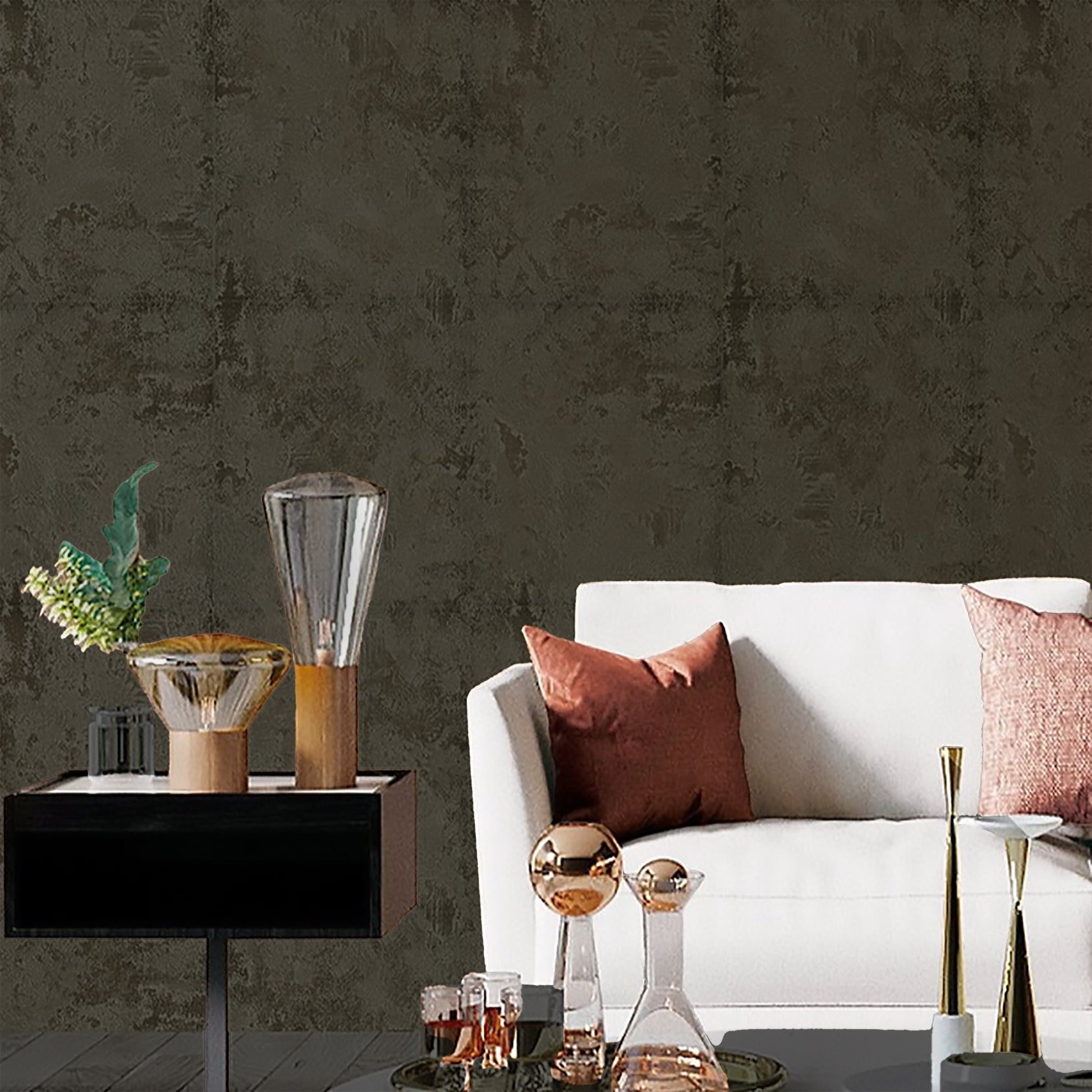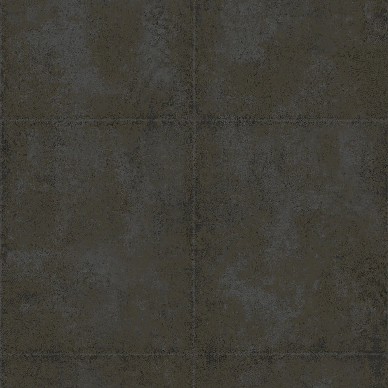 Su patrón no es repetitivo, sino que imita una superficie desgastada o rugosa, similar al hormigón, el estuco o una pared de metal oxidado. El color principal es un marrón oscuro, casi carbón, con sutiles variaciones de tonos que le otorgan profundidad y carácter.