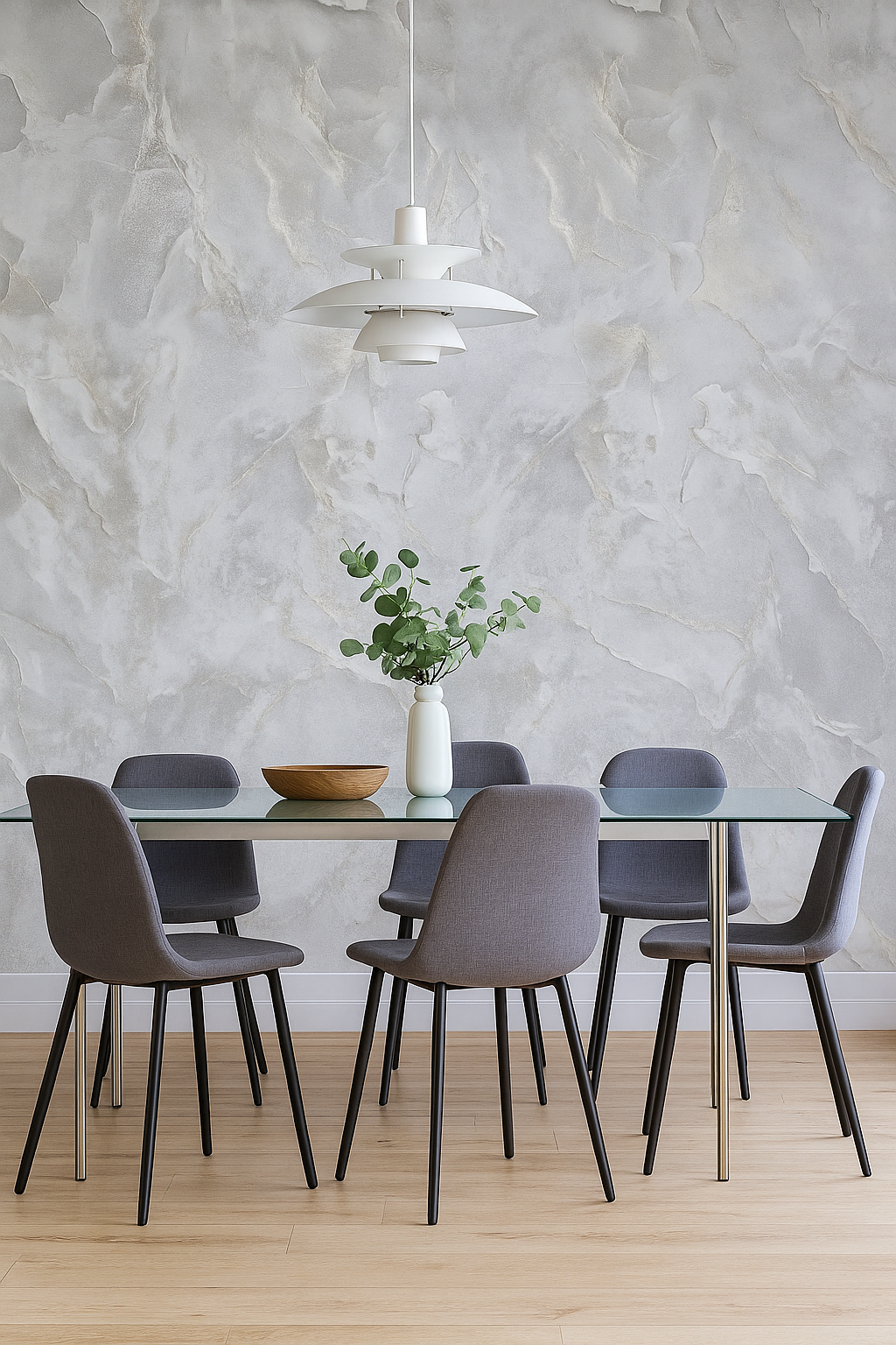 El patrón es grande y fluido, sin repeticiones obvias a primera vista, lo que le da un aspecto muy auténtico y de alta gama. Contribuye a crear un ambiente elegante y moderno, sirviendo como un punto focal suave que añade profundidad y textura sin abrumar el espacio.