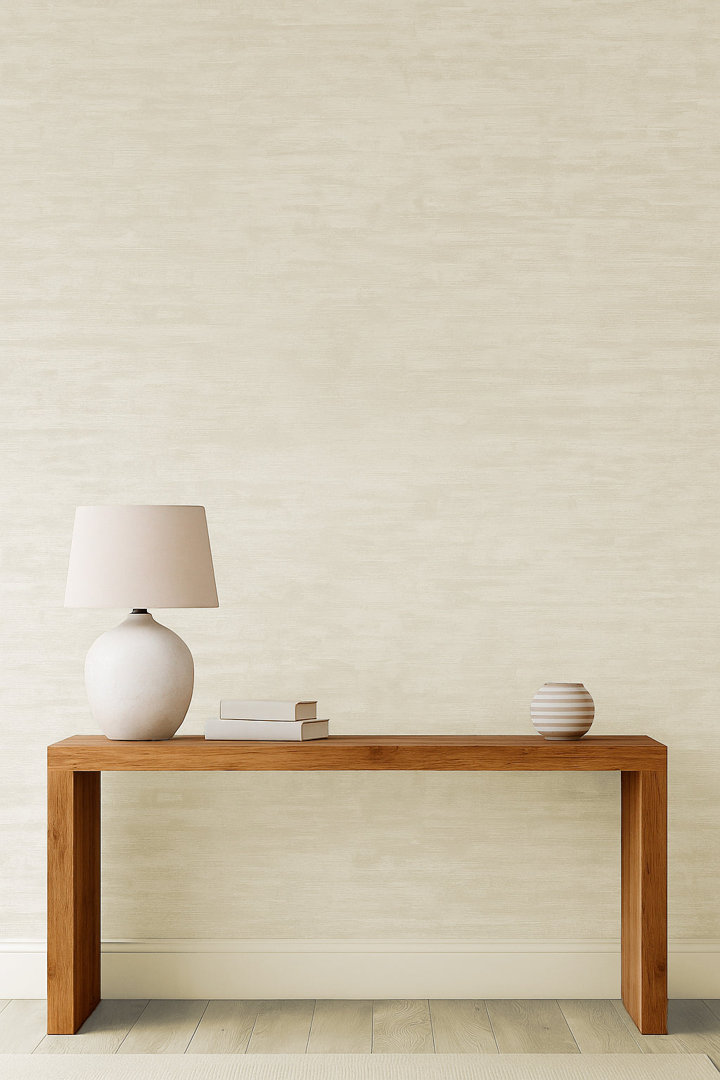 El papel de colgadura que has subido es de un color blanco crema con una textura que imita la tela o el tejido de lino. Su diseño es bastante sutil, con líneas horizontales finas y una apariencia ligeramente desgastada o texturizada, lo que le da un toque orgánico y natural.