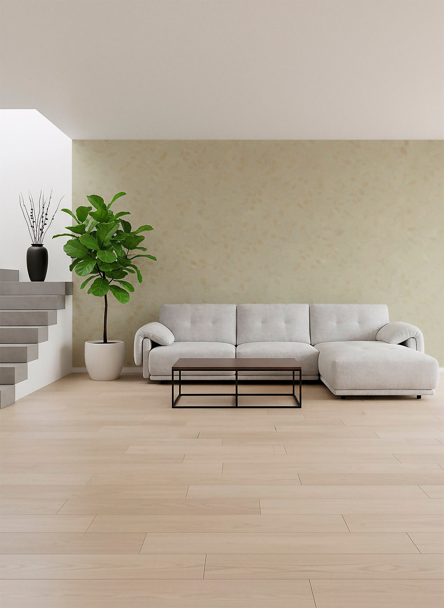 El papel tapiz presenta un patrón de diseño floral o de follaje que se repite sobre un fondo claro, que parece ser un tono crema muy pálido o blanquecino. El patrón está compuesto por enredaderas o tallos delicados de los que brotan hojas estilizadas. Este diseño tiene un aire clásico y elegante. El contraste se logra mediante el uso de dos tonos muy sutiles, dándole una apariencia monocromática o ton-sur-ton (tono sobre tono):El fondo es el color base, claro y suave. El diseño de hojas y tallos parece estar impreso con un acabado metálico mate o un color que puede ser un beige muy claro, dorado pálido o champaña, lo que le da un ligero brillo o luminosidad al diseño al captar la luz.