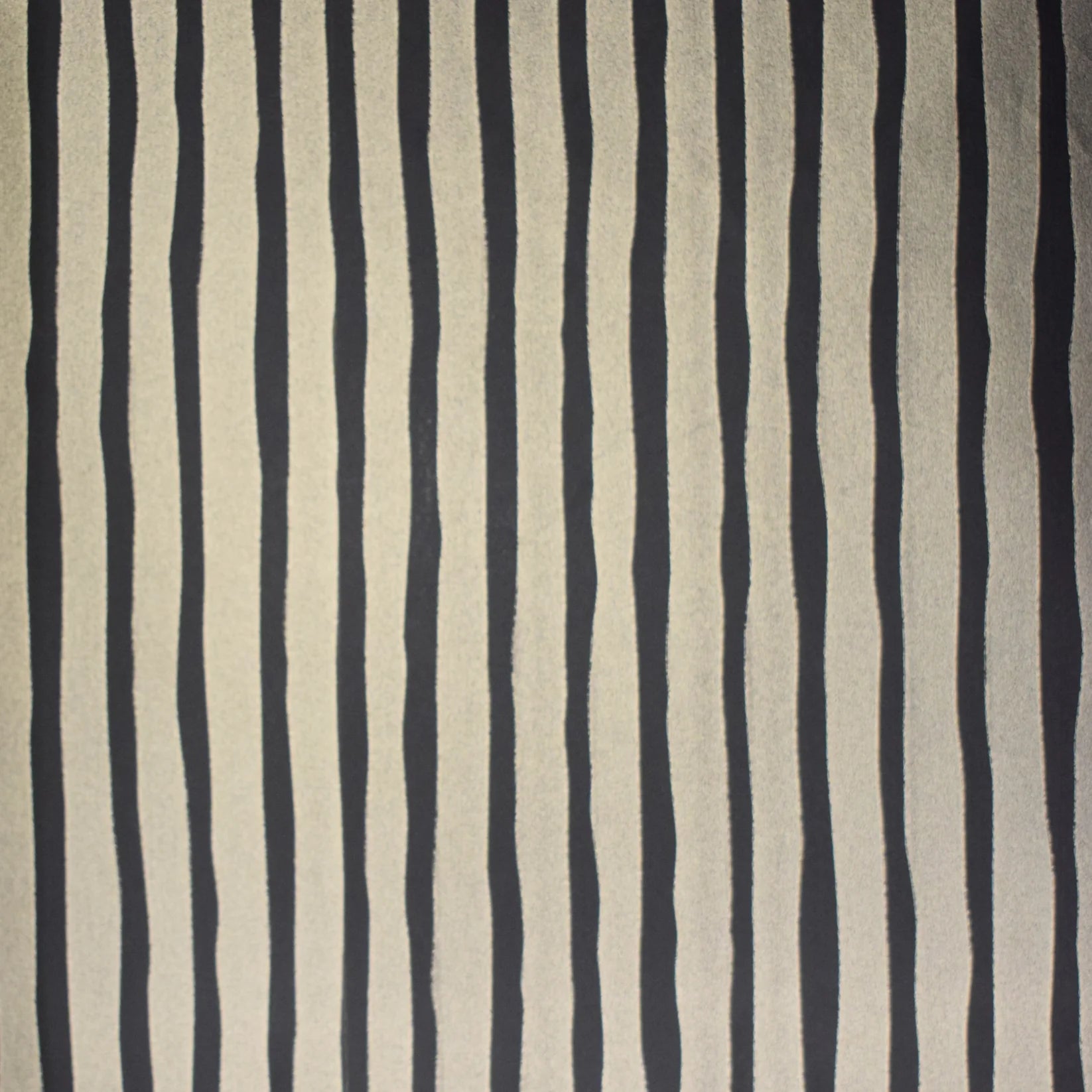 Diseño y Patrón: El patrón es una línea vertical continua. A diferencia de las rayas tradicionales, estas no son perfectamente rectas ni uniformes. Las rayas oscuras son de ancho variable y tienen bordes ondulados y orgánicos, dando la impresión de haber sido pintadas a mano alzada con un pincel ancho. Esta imperfección intencional le confiere al diseño un carácter artesanal, moderno y dinámico, evitando la rigidez de un patrón de rayas estricto. El contraste fuerte y la orientación vertical crean un efecto que visualmente añade altura a la pared.