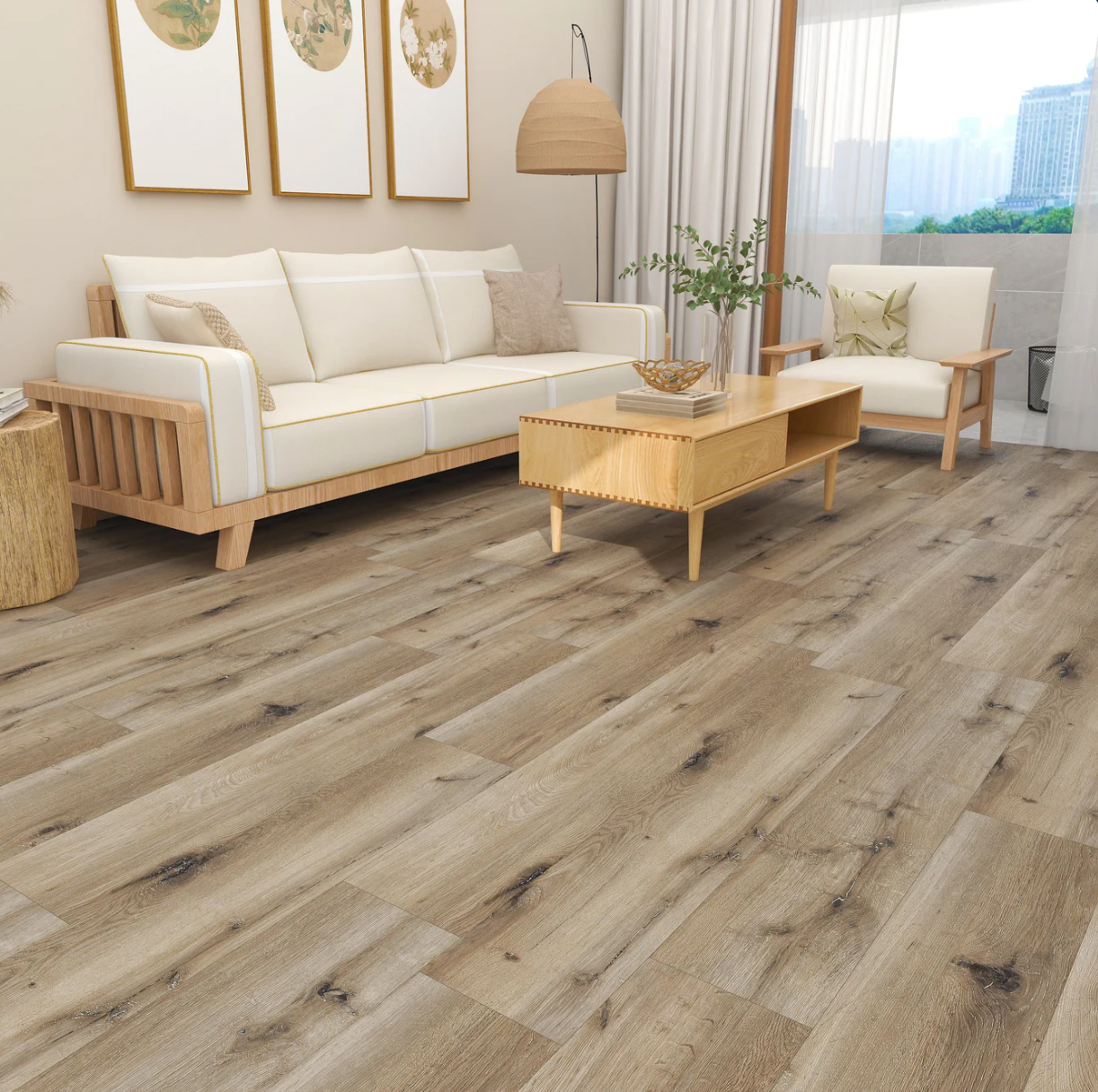 MATERIAL: SPC (Compuesto por polvillo de piedra caliza y resinas plásticas, PVC y capa de rodamiento)